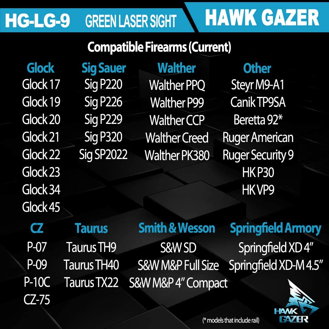 The HAWK GAZER LG9 Green Laser Sight is a lightweight, durable, and compact device designed for use with handguns, pistols, and rifles that have rails. Featuring a Class IIIa output of <5mw, it offers exceptional visibility even in daylight. Its slim profile and fiber-reinforced nylon construction add only 1.85 oz to the weight of your firearm. The HG-LG-9 also includes fast USB Type-C charging, eliminating the need for batteries. Its ambidextrous controls, conveniently located on both sides of the trigger guard, make activation easy. Simply hold the on/off switch for three seconds to activate the pulse mode. The kit comes with the HG-LG-9, a USB-C charging cable, and an Allen wrench for simple adjustments. Be sure to check the images for compatible firearm models.